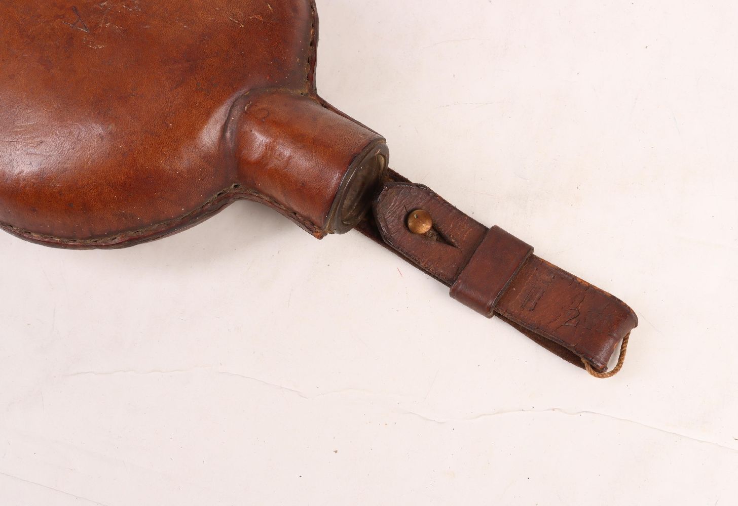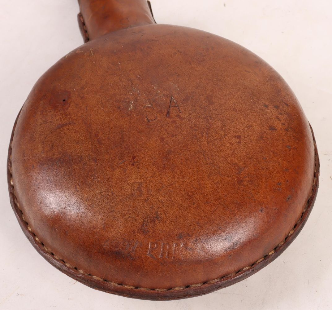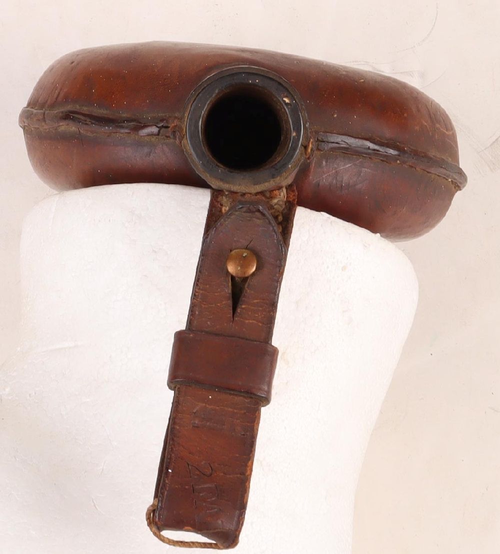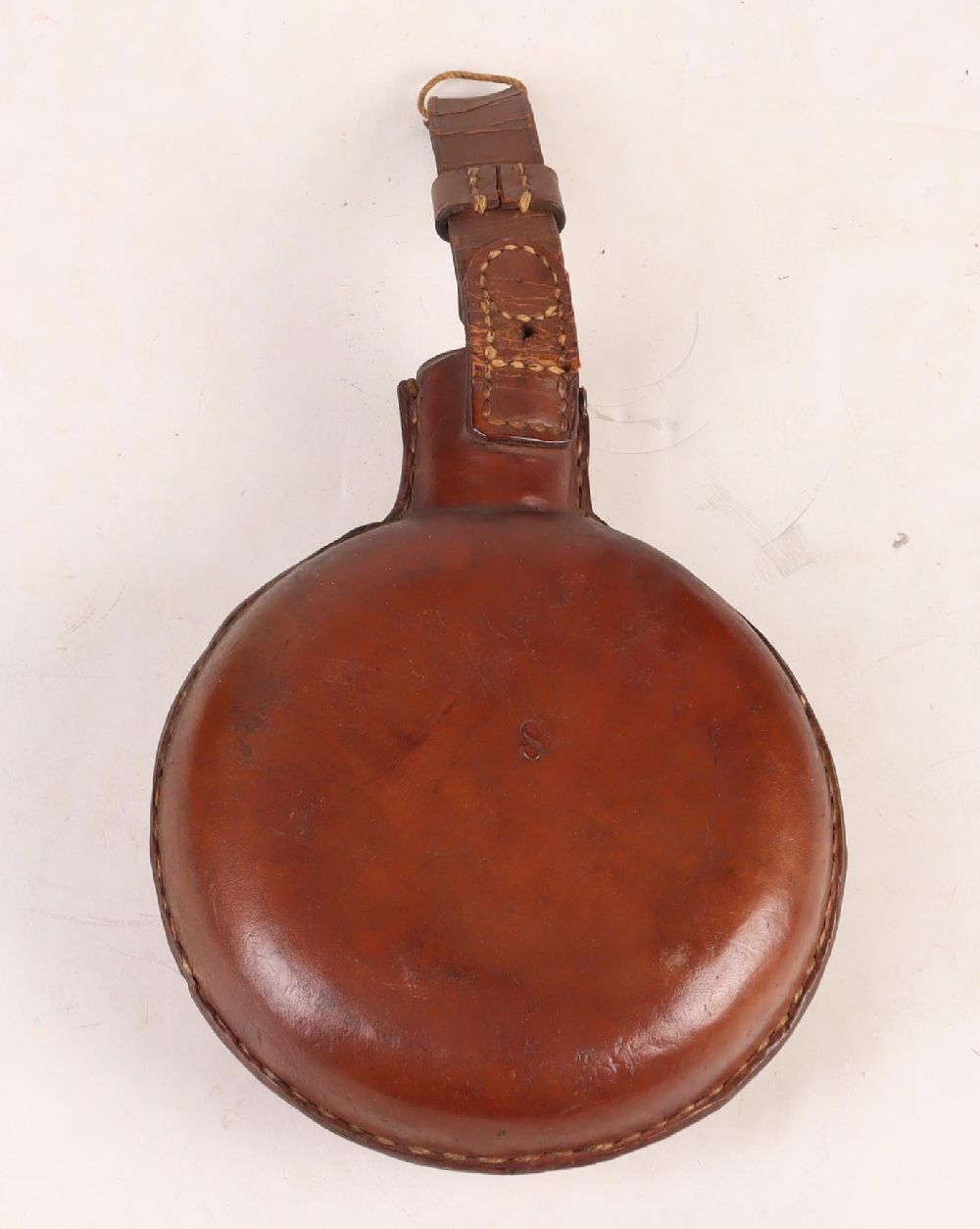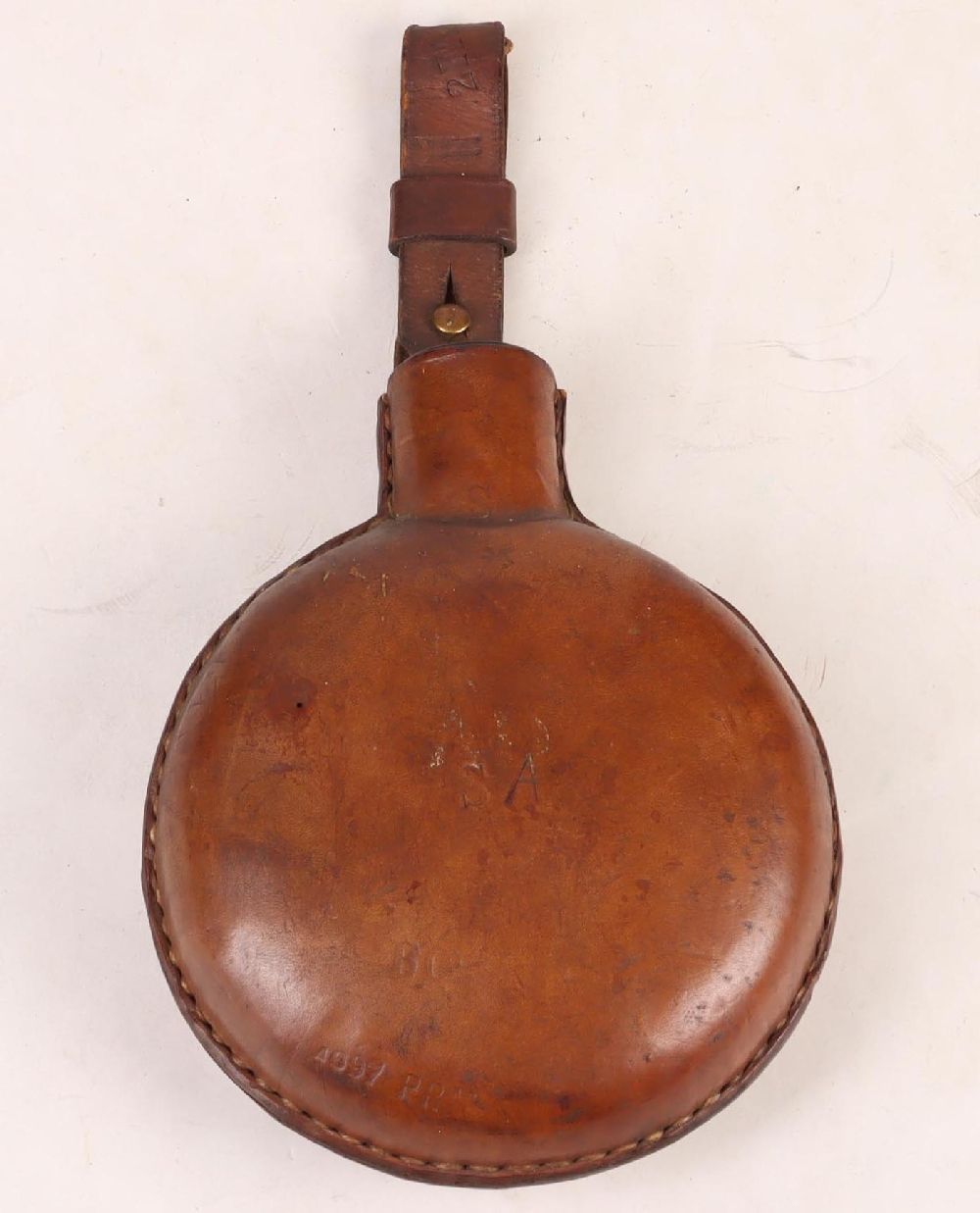 Army. Boer War era, Indian pattern water bottle. Glass bottle with leather stitched on cover possibly dated 1897, other stamps include SA, BC, PRM also to strap 2FAI. Strap beginning to tear at bottle neck. Strap is presumably for belt or horse mounting. Bottle has no stopper. Average-GC. Would look great on Boer War era uniform.